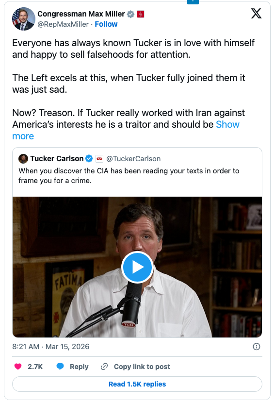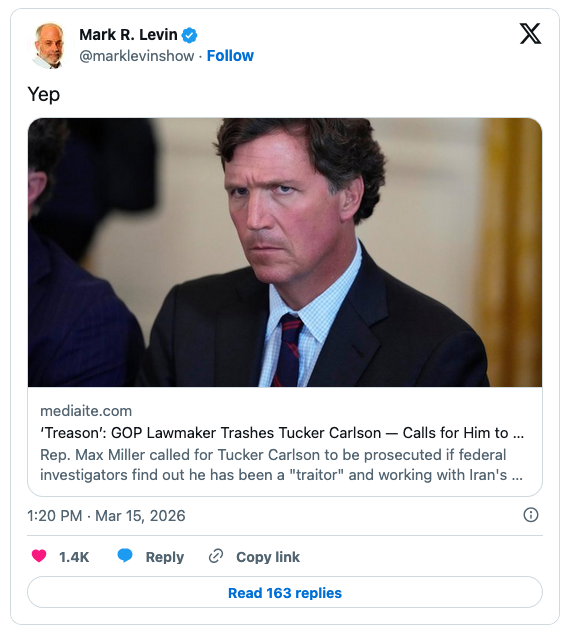 Levin and others have been on a hate-Carlson tear for some time. Last year, the Israel-first commentator called Carlson a “maggot,” and on Sunday he called for his arrest. The Iran-war enthusiast reposted a Mediaite story on X about Miller’s call for Carlson’s prosecution. “Yep,” the Iran-War enthusiast wrote over the post.