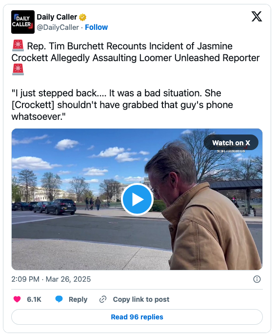 She also called hearings about National Public Radio “bullsh*t,” then assaulted a reporter by aggressively trying to snatch his camera. Loomer Unleashed correspondent Charles Downs asked about a Tesla Takedown meeting at which Crockett said she wanted Tesla chieftain Elon Musk “taken down” for her birthday. When he asked whether Crockett condoned violence, she grabbed for his camera.