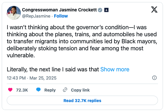 Crockett later said that “I wasn’t thinking about the governor’s condition — I was thinking about the planes, trains, and automobiles he used to transfer migrants into communities led by Black mayors, deliberately stoking tension and fear among the most vulnerable.”