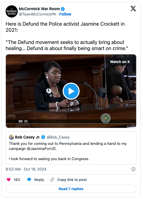 Crockett is also the big hypocrite. She doesn’t believe her own press releases. In 2021, she explained why police must be defunded.