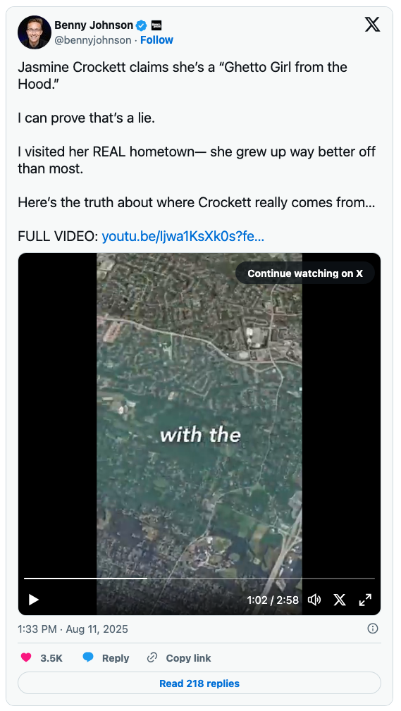 In August, commentator Benny Johnson posted a video about Crockett’s well-to-do upbringing that belies her claims that she’s a “ghetto girl from the Hood.” In fact, Crockett was educated at fancy private schools, including the private Rhodes College in Tennessee, where tuition and room and board is almost $80,000 a year. She spoke normal English before she began what Johnson called “code-switching.”