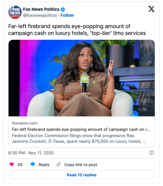 “Crockett’s filings show her campaign spending $25,748.87 since January on high-end hotels and limousine services,” Fox reported: