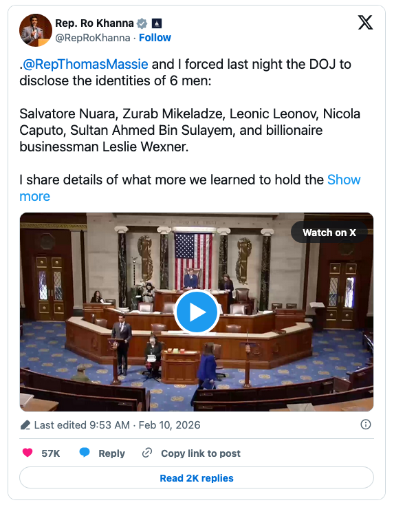 Among the information the FBI tried to conceal was the identity of six powerful men named in the files. Khanna said the DOJ hid those names “for no apparent reason.” He then said the names on the floor. “These men are Salvatore Nuara, Zurab Mikeladze, Leonic Leonov, Nicola Caputo, Sultan Ahmed Bin Sulayem [CEO of a Dubai-based global logistics and ports operator], and billionaire businessman Leslie Wexner, who was labeled as a co-conspirator.”