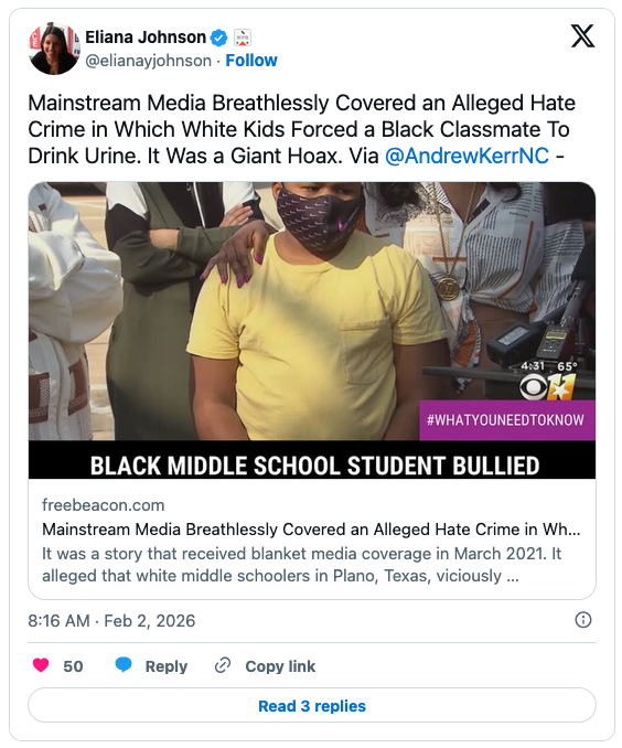 The story was this … supposedly. Evil white “middle schoolers in Plano, Texas, viciously ‘tortured’ SeMarion Humphrey, their black classmate, forcing him to drink their urine at a sleepover as they shot him with BB guns,” the Beacon reported: