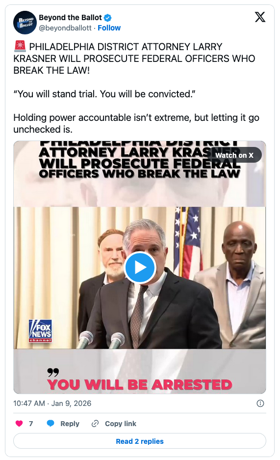 On CNN, Rochelle Bilal reiterated what she said during a news conference: that ICE officers are “fake law enforcement” who would not be spared prosecution. Equally unhinged District Attorney Larry Krasner repeated that promise, telling ICE to get the “F” out of his city.