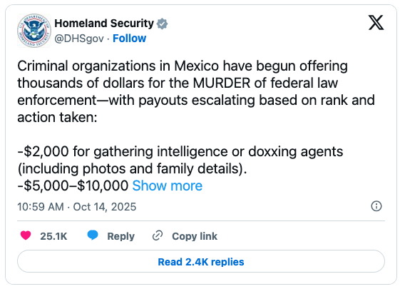 In October, during an operation in Chicago, DHS reported that the cartels had set up a three-tiered bounty system: