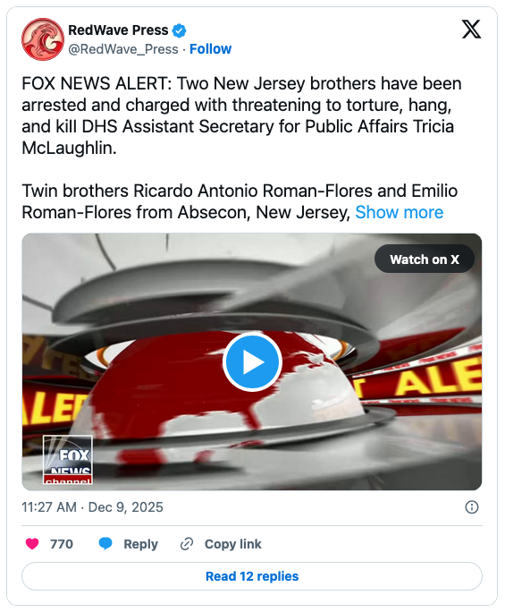 Ricardo Antonio Roman-Flores and Emilio Roman-Flores, twins from Absecon, New Jersey, … were arrested after allegedly posting to X that they wanted to torture and kill McLaughlin in a medieval fashion.