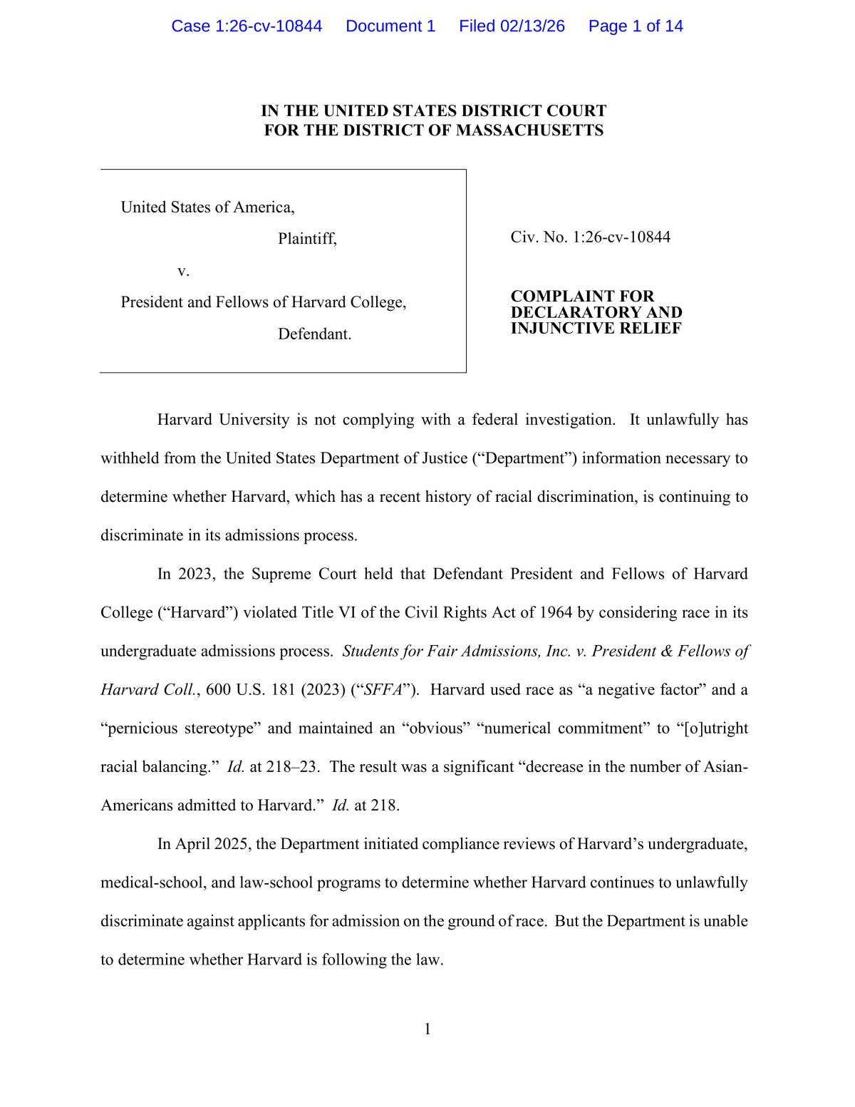 The 14-page complaint in the U.S. District Court in Massachusetts opens bluntly: “Harvard University is not complying with a federal investigation. It unlawfully has withheld from the United States Department of Justice (“Department”) information necessary to determine whether Harvard, which has a recent history of racial discrimination, is continuing to discriminate in its admissions process.”