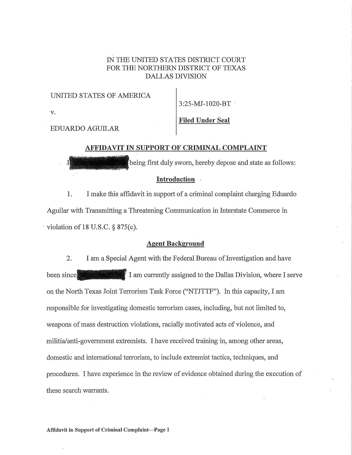 The complaint alleges that Aguilar violated 18 U.S.C. § 875(c), which forbids using interstate communications to transmit a death threat.