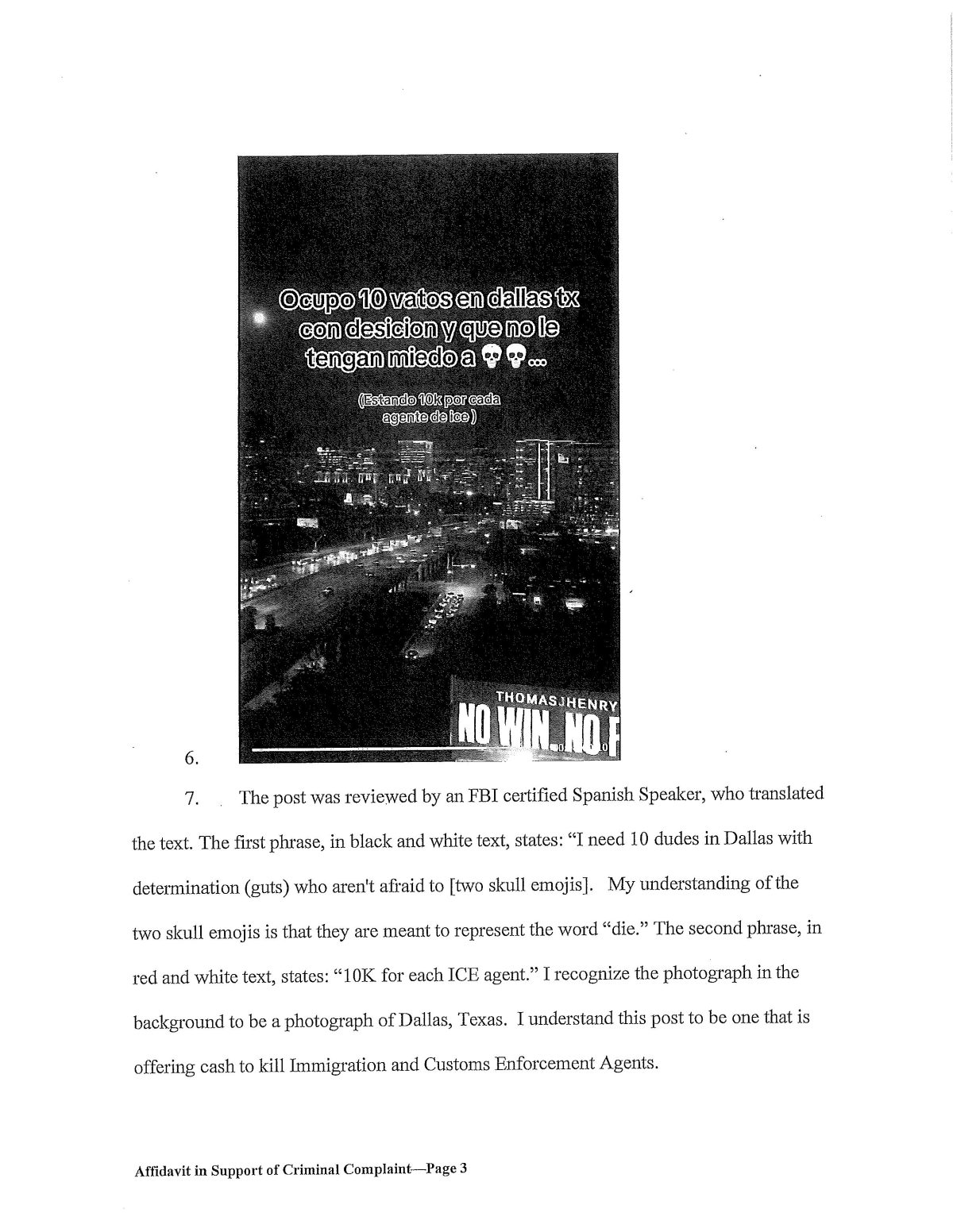 A criminal complaint dated October 11 and previously sealed says FBI agents with the North Texas Joint Terrorism Task Force reported that the Dallas Police Department told the bureau on October 10 about “a TikTok post soliciting individuals to murder ICE agents.”