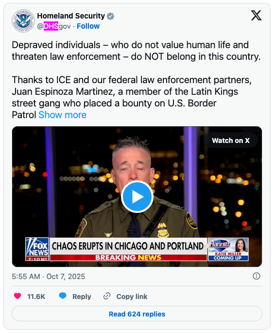 “On October 03, 2025, a confidential source provided information indicating a ‘hit’ had been placed on Chief Bovino by a member of the Latin Kings Street Gang,” DHS reported. Agents arrested Martinez in Burr Ridge, Illinois, after Homeland Security Investigations