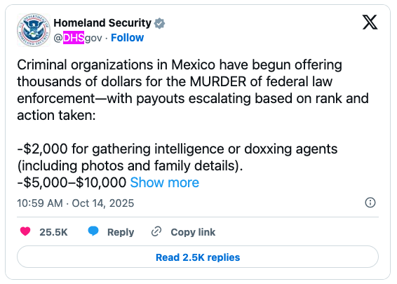 $5,000–$10,000 for kidnapping or non-lethal assaults on standard ICE/CBP [Customs and Border Protection] officers.