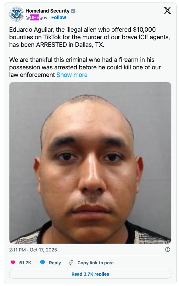 This time, the suspect is Mexican Eduardo Aguilar, who posted his death wish for ICE agents — and the reward for murdering them — on TikTok.