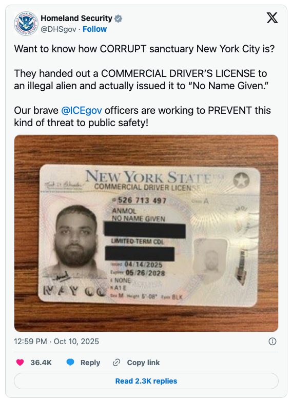One of the illegals carried a CDL from New York with the name “No Name Given.”