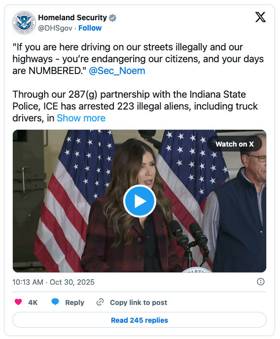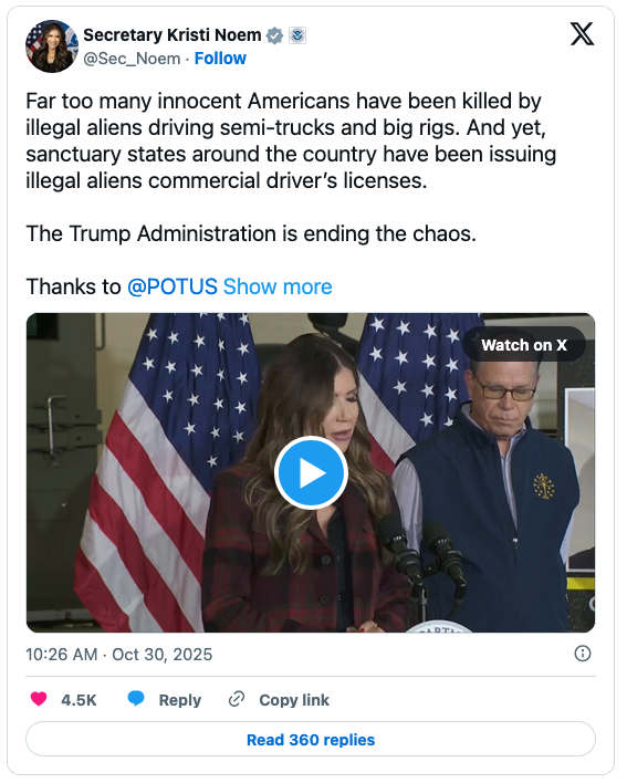 “Far too many innocent Americans have been killed by illegal aliens driving semi-trucks and big rigs,” Noem wrote on X over video of her announcement.