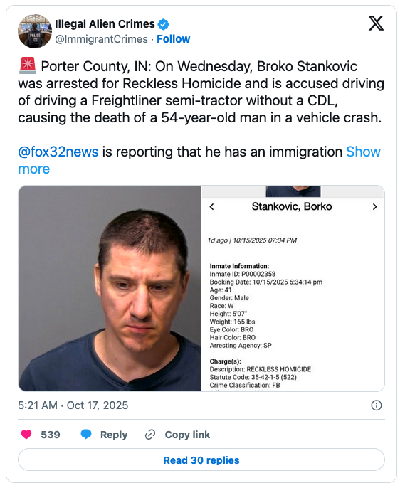 “Stankovic was operating a semi-truck without a valid commercial license, when he swerved into oncoming traffic and hit a Subaru Crosstrek,” DHS reported. “The driver of the Subaru, Jeffrey Eberly, tragically died at the scene.”