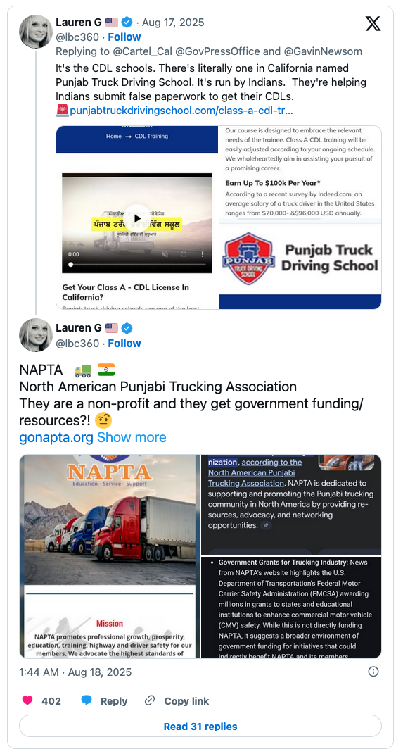 Indeed, Indians are quite eager to become truck drivers. After the wreck in which Harjinder Singh left three people dead, an internet sleuth found out that Indian illegals have the perfect place to get CDL training: the Punjab Truck Driving School. After “graduating” from that estimable academy, an Indian illegal can join the North American Punjabi Trucking Association. It is “the proud representative of the Punjabi trucking industry,” it brags on its website.