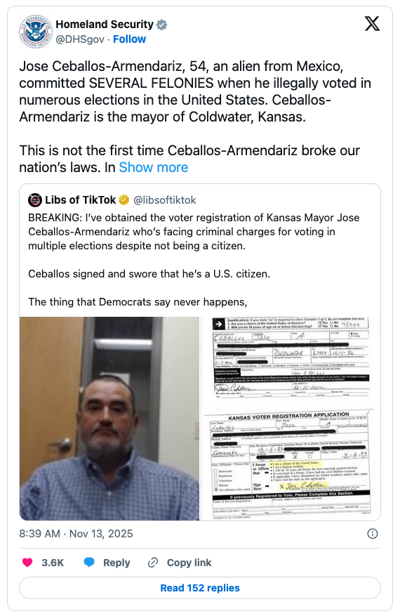 The Department of Homeland Security (DHS) has released the voter registration documents that show a small-town mayor in Kansas lied when he claimed to be a U.S. citizen.