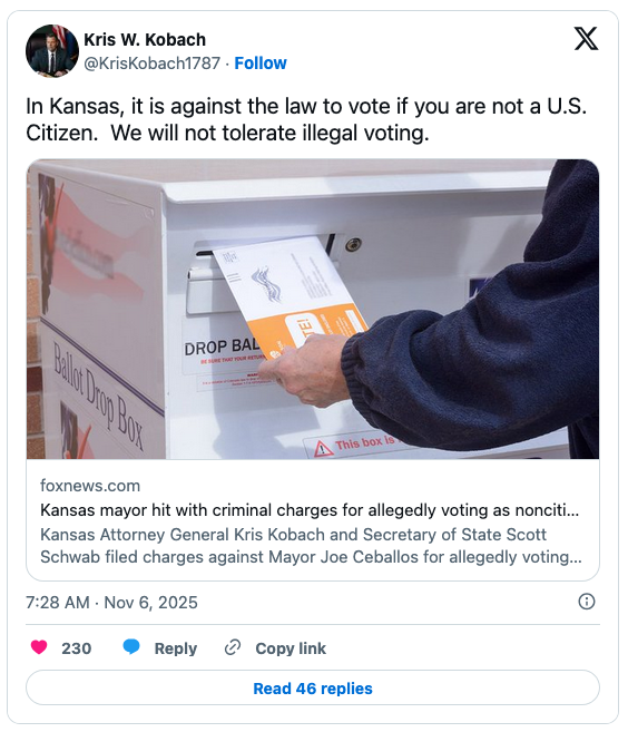 Last week, Kansas Attorney General Kris Kobach charged Coldwater Mayor-elect Jose Ceballos with voter fraud. Elected mayor with more than 80 percent of the vote, Ceballos is not a citizen, yet claimed he was on forms. He voted in three elections, Kobach alleged.