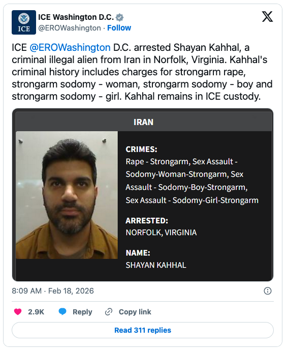 Agents arrested Shayan Kahhal, an illegal Iranian whose “criminal history includes charges for strongarm rape, strongarm sodomy – woman, strongarm sodomy – boy and strongarm sodomy – girl.”