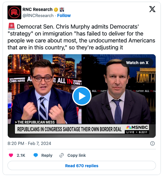 In 2024, speaking with MSNBC talker Chris Hayes, Murphy complained that Democratic strategy on immigration “has failed to deliver for the people we care about most, the undocumented Americans that are in this country.”