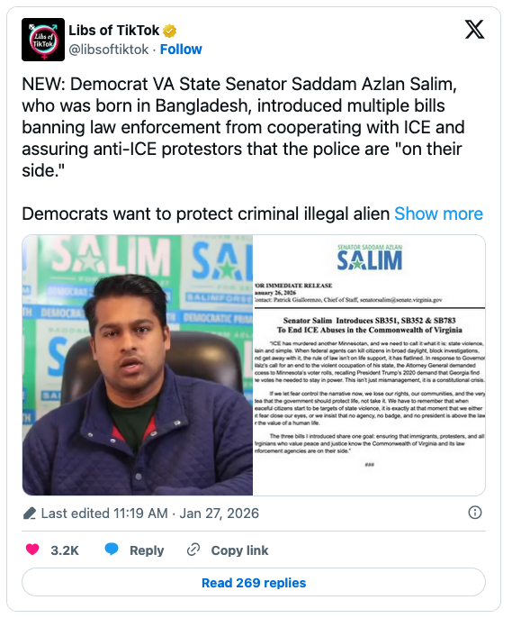Salim, a Bangladeshi who probably hadn’t used indoor plumbing before he invaded to the United States, is pushing three anti-ICE bills.