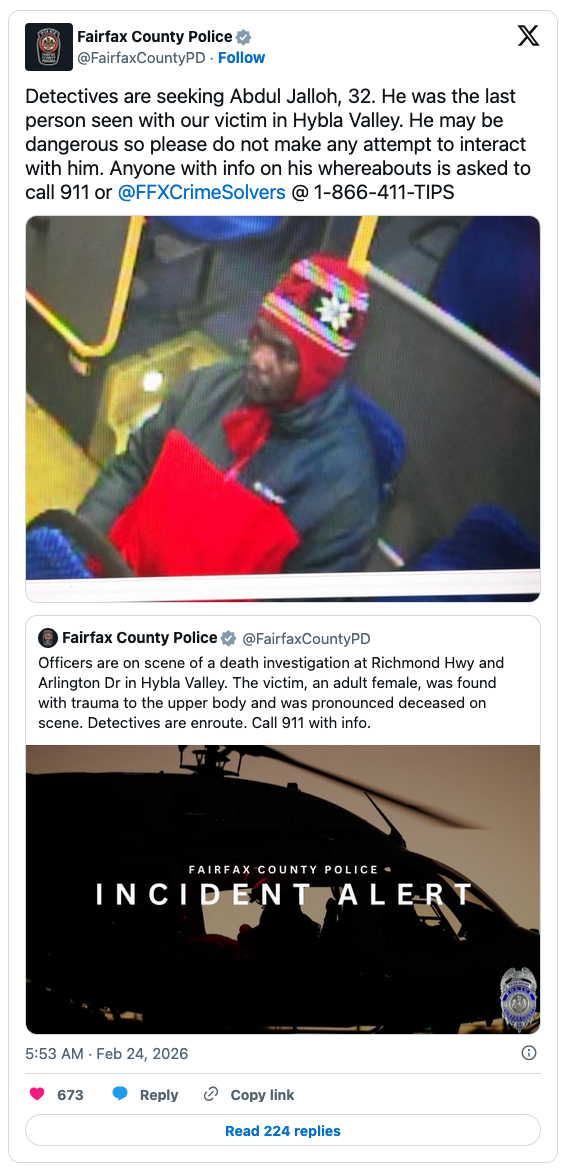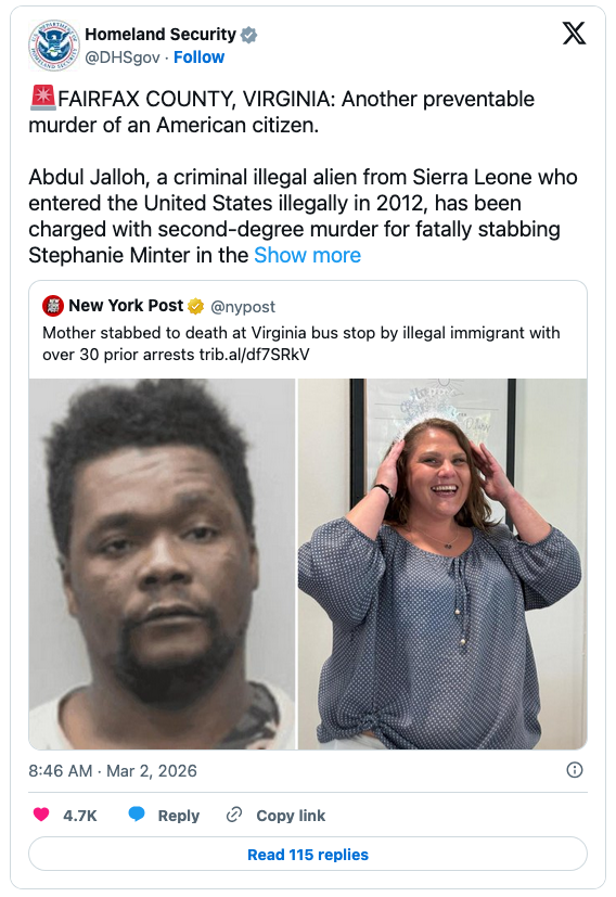 “We are calling on Virginia Governor Abigail Spanberger and Virginia’s sanctuary politicians to commit to not releasing this murderer and violent career criminal from their jail without notifying ICE,” said Deputy Assistant Secretary Lauren Bis. “This illegal alien’s murder of an innocent, beautiful American woman came less than 24 hours before Governor Spanberger’s demonization of ICE law enforcement.”