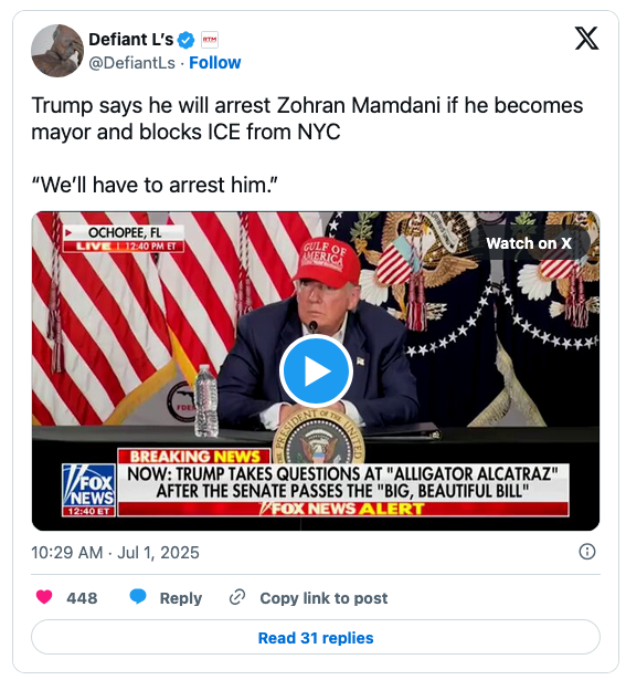 Speaking from the Alligator Alcatraz illegal-alien detention center, a 3,000-bed relaxing spa surrounded by the man-eaters, Trump correctly warned Marxist Mamdani of his fate should he defy federal law.