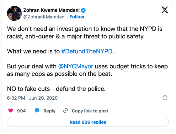 He wants to defund New York’s “racist” police, and doesn’t believe police should answer domestic violence calls.