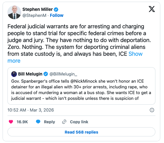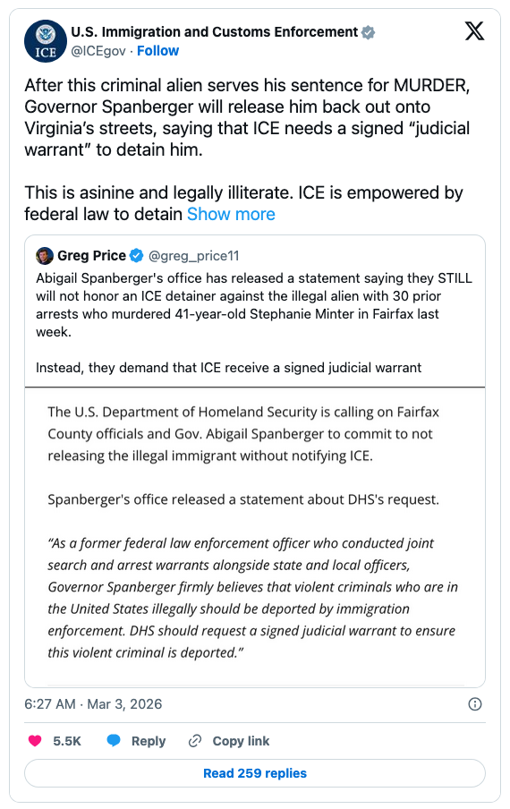 Spanberger claimed that ICE needs a “judicial warrant” to require a transfer to ICE custody. That claim is false, as White House aide Stephen Miller noted. Immediately upon taking office, Spanberger blocked state police and other agencies from cooperating with ICE on deportations.