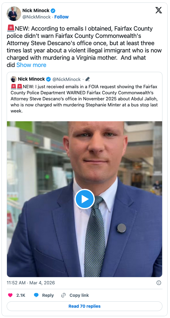 The warnings, ABC affiliate WJLA reported, came in multiple emails to Commonwealth’s Attorney Steve Descano, who repeatedly refused to prosecute Abdul Jalloh, later charged with murdering Stephanie Minter at a bus stop. A report in the Washington Examiner fingered Descano as a Soros prosecutor whose main job is keeping murderers and other dangerous criminals out of prison.