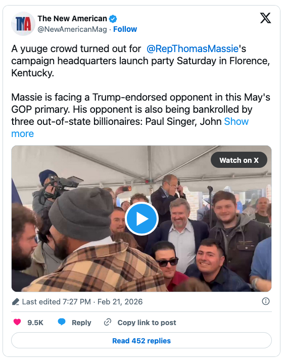 Massie will be working overtime over the coming weeks. He is facing an opponent in May’s Republican primary who is endorsed by Trump and backed by neocon out-of-state billionaires including John Paulson, Paul Singer, and Miriam Adelson. The president wants Massie fired and replaced with someone who will choose party over principle. Ed Gallrein, a former Navy SEAL who subscribes to Trump’s interventionist foreign policy, wants Massie’s seat. He ran for state office in 2024 but lost to another SEAL. Nevertheless, he is expected to produce Massie’s toughest contest since the constituents of District 4 first elected him more than a decade ago.