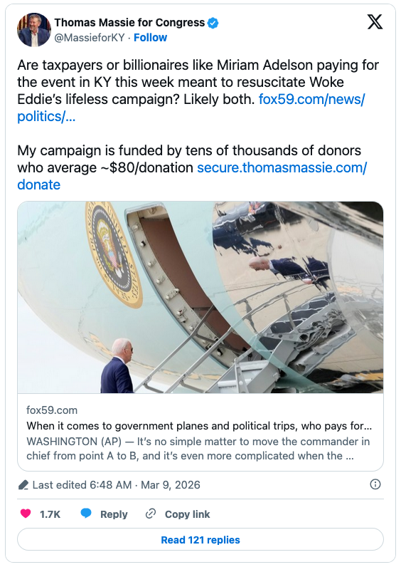 Massie’s campaign commented on Monday about Trump’s visit. “Are taxpayers or billionaires like Miriam Adelson paying for the event in KY this week meant to resuscitate Woke Eddie’s lifeless campaign?” it asked. “Likely both.”