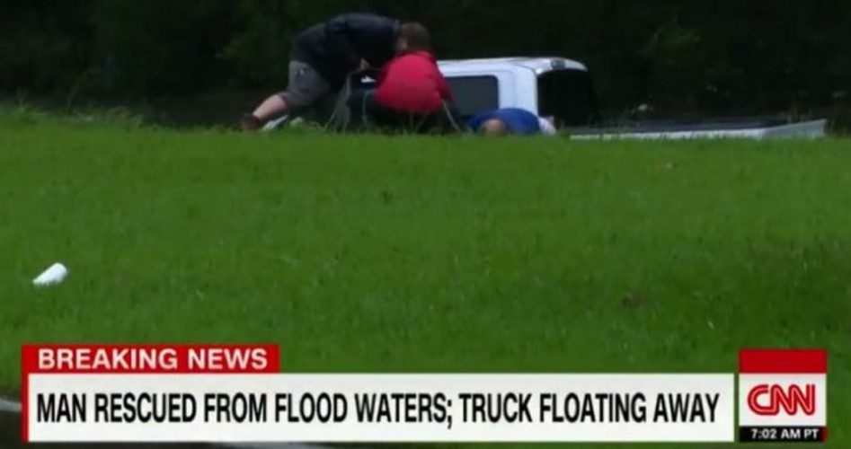 Sharp eyes at Conservative Treehouse noted something strange, however, and it was picked up by Monica Showalter at American Thinker and elsewhere. A careful viewing of the video reveals several things that didn’t fit. First, the driver, reported to be Jerry Sumrall of Winnie, Texas, drove his white pickup truck very slowly into the ditch and when the water began lifting the front end of his vehicle off the ground, Sumrall calmly rolled his window down, as if he was following instructions. This occurred at the 30-second mark.