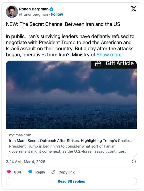 “A day after the attacks began, operatives from Iran’s Ministry of Intelligence reached out indirectly to the C.I.A. with an offer to discuss terms for ending the conflict, according to officials briefed on the outreach,” the newspaper reported:
