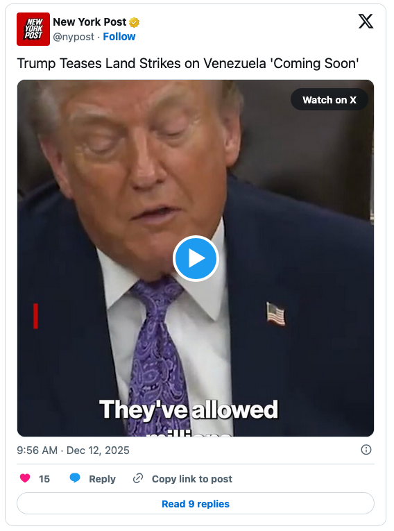 For the second time this month, and a day after U.S. authorities seized a Venezuelan oil tanker off the South American country’s coast, U.S. President Donald Trump has said that “land strikes” against the country are ahead, and “soon.”