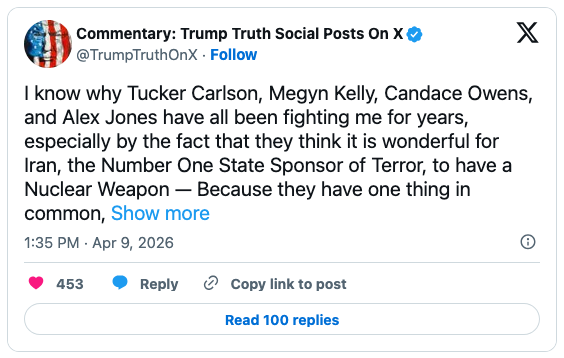 “Trump went on Truth Social and called Tucker Carlson, Megyn Kelly, Candace Owens, and Alex Jones low IQ and stupid,” he wrote on X: