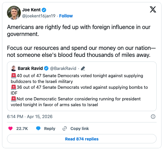 “Americans are rightly fed up with foreign influence in our government,” he wrote later. “Focus our resources and spend our money on our nation — not someone else’s blood feud thousands of miles away.”