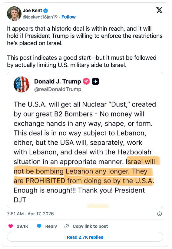But Kent did not respond in kind. Instead, he congratulated the president on X for supposedly getting Iran to reopen the Strait of Hormuz, which might portend an “historic deal.” As well, Kent said, although Trump stopped Israel from bombing Lebanon further, he must be willing to enforce the restriction.
