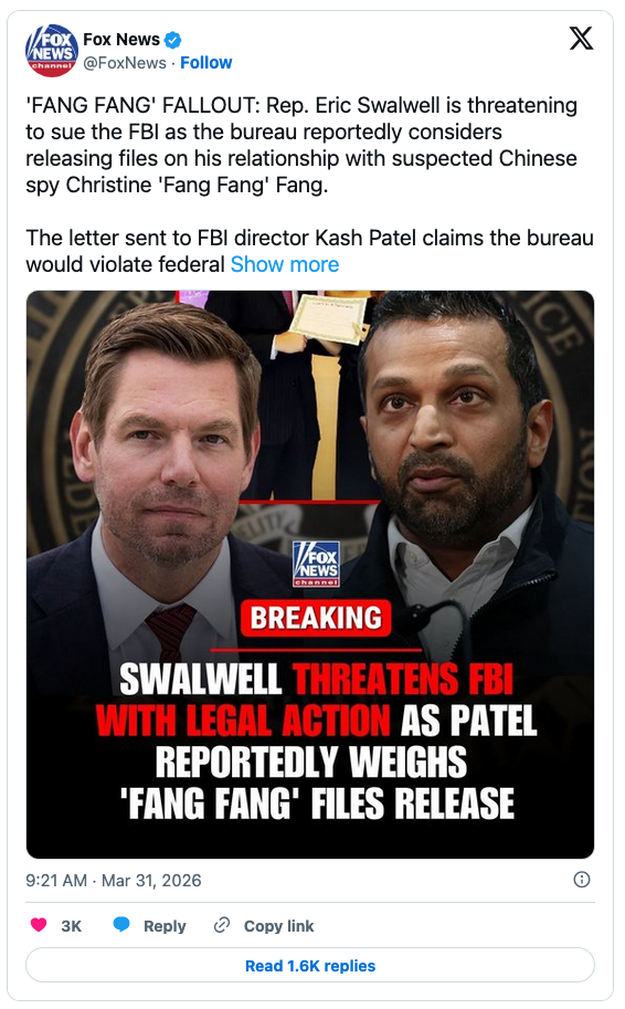 How friendly isn’t clear. But Swalwell was apparently so miffed about the release of files that he lawyered up, AP reported. His attorneys demanded that the FBI stop any such plan to release the skinny on him and the Chinese temptress Fang Fang.