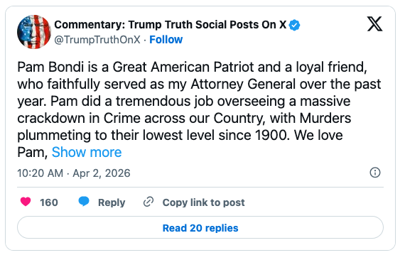 Trump announced today on Truth Social that Bondi got the pink slip. He praised the lawyer from Florida as if nothing much was amiss, almost as if Bondi had decided to quit of her own volition.