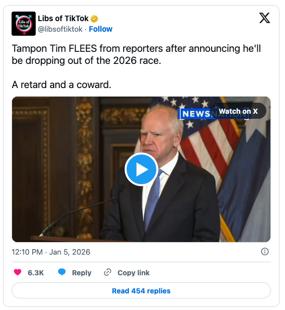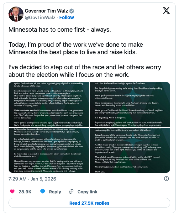 “Walz met with Klobuchar on Sunday, Jan. 4 before he announced the following morning that he is dropping out of the 2026 governor’s race, multiple people familiar with the meeting said,” the newspaper continued.
