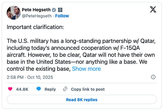 Qatar is getting an air force training facility in Idaho, U.S.A. Defense Secretary Pete Hegseth made the announcement on October 10. Despite the intense criticism the administration incurred after the news broke, this isn’t the first arrangement of this kind on American soil.