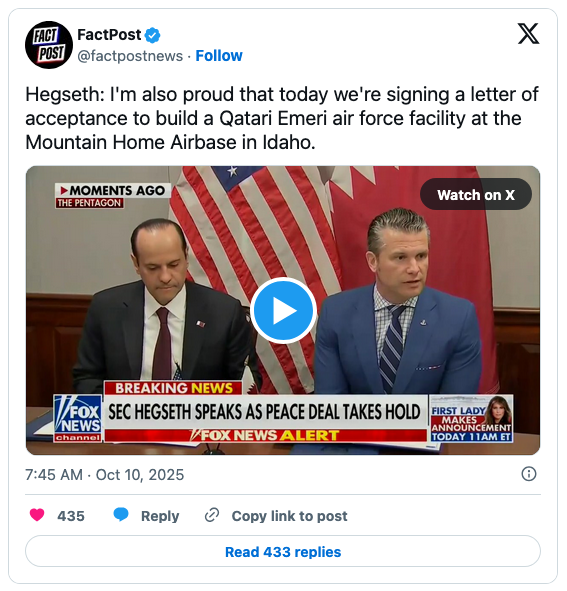 Today … we’re signing a letter of acceptance to build a Qatari Emeri air force facility at the Mountain Home Airbase in Idaho. The location will host a contingent of Qatari F-15s and pilots to enhance our combined training, increase lethality, interoperability. It’s just another example of our partnership.