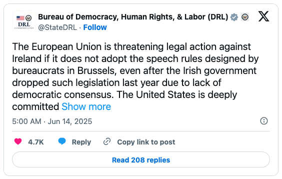 The EU’s bullying hasn’t gone unnoticed stateside. Vice President J.D. Vance told the Irish ambassador back when he was a senator that he was concerned the bill may “undermine Ireland’s commitment to universally prized freedoms, including the freedom of speech.” And back in June, the U.S. State Department’s Bureau of Democracy, Human Rights, and Labor (DRL) issued a statement in support of Irish free speech and in opposition to “speech rules designed by bureaucrats in Brussels” that lack “democratic consensus.”