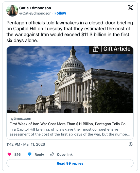 Meanwhile, the cost of the war grows by the minute. The first six days of the war cost taxpayers more than $11 billion.