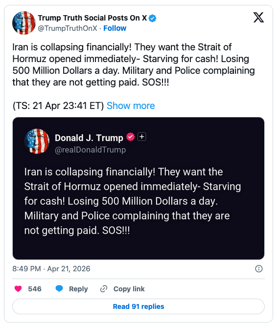 On Tuesday, Trump claimed that the blockade had collapsed Iran’s economy, and that the nation was losing $500 million daily.