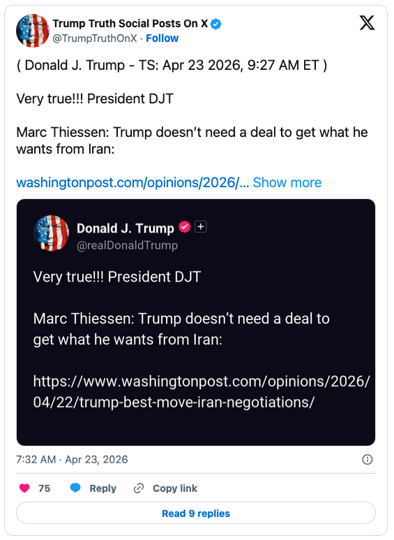 And Trump reposted on X a line from Washington Post columnist Marc Thiessen, who argues that the Iranians need a deal and Trump doesn’t. Trump must therefore kill anti-peace deal officials.