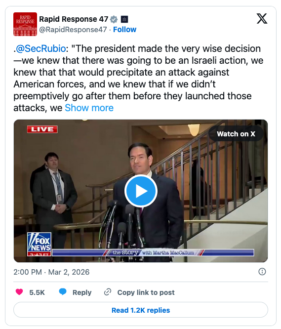 But then Rubio spilled the beans. Trump had to attack because Israel had decided to attack.