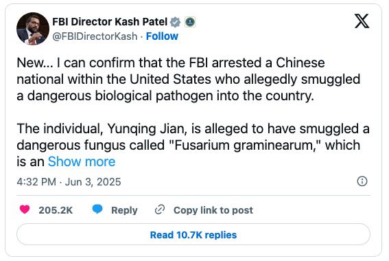 In June, Yunqing Jian, a postdoctoral fellow at UM, smuggled Fusarium graminearum into the United States, prosecutors alleged. Also charged was her boyfriend, Zunyong Liu. He worked at a university in China that was also experimenting on the same organism. The pair was charged with conspiracy, smuggling goods into the United States, false statements, and visa fraud.